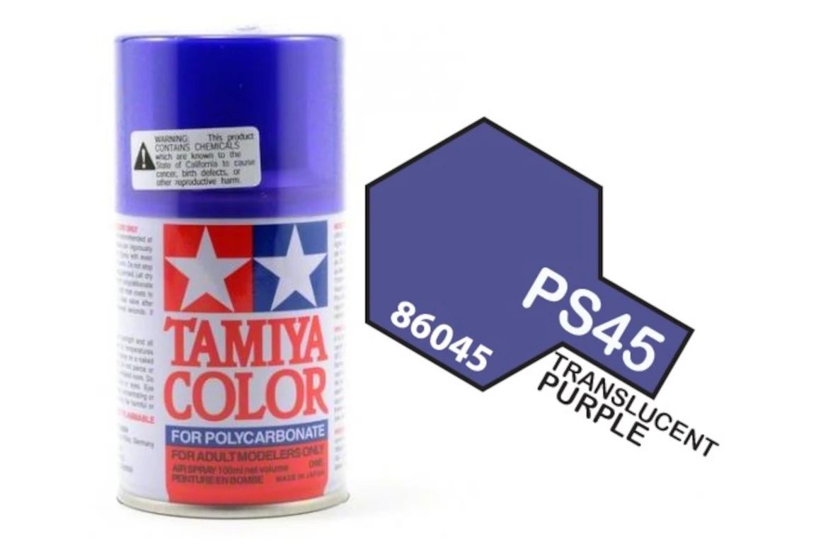 Tamiya PS-45 Translucent Purple, drift severler için tanıdık bir şeffaf mor renkli sprey boyadır. En son kat gümüş veya siyah renk önerilir.
